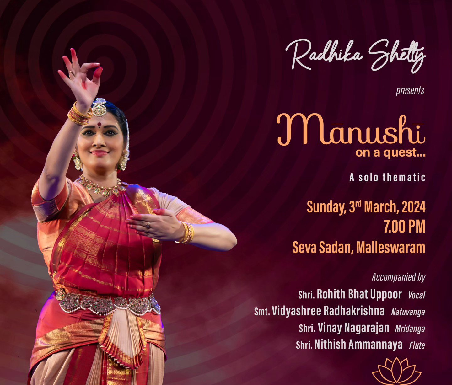 ಮಂಗಳೂರಿನ ನೃತ್ಯಗಾತಿ ರಾಧಿಕಾ ಶೆಟ್ಟಿ ಅವರ “ಮಾನುಷಿ” ನೃತ್ಯದ ಪರಿಕಲ್ಪನೆಯ ನೃತ್ಯ ಸಂಯೋಜನೆಯಲ್ಲಿ ಸರಸ್ವತಿ, ಮೀರಾಬಾಯಿ, ದೇವಕಿ ಮತ್ತು ಅಕ್ಕಮಹಾದೇವಿ ಅವರ ಭಕ್ತಿ ಪ್ರಧಾನ ನಾಟ್ಯ ಪ್ರದರ್ಶನ ಪ್ರೇಕ್ಷಕರನ್ನು ಅತ್ತಿತ್ತ ನೋಡಲು ಬಿಡಲಿಲ್ಲ. ಅತ್ಯಂತ ಸೊಗಸಾದ ಅಭಿನಯ ನೀಡುವ ಮೂಲಕ ಹಾಗೂ ಅವರ ಹಸ್ತ ಶುದ್ಧಿ ಗಮನಾರ್ಹವೆನಿಸಿತು. ವಿಶೇಷವಾಗಿ ಮೀರಾಬಾಯಿ ಮತ್ತು ದೇವಕಿಯ ನೃತ್ಯ ಪ್ರದರ್ಶನ ಅಪರೂಪದ್ದಾಗಿತ್ತು. ಗಿರಿಧರ ಗೋಪಾಲ ಅಂಕಿತದಲ್ಲಿ ಭಕ್ತಿ ಸಾಗರದ ಅಲೆ ಅಲೆಯಲ್ಲೂ ಕಾಣಿಸಿಕೊಳ್ಳುವ ಮೀರಾ ಗೋಪಾಲನಿಗಾಗಿ ಹಂಬಲಿಸುವ ಪರಿಯನ್ನು ರಾಧಿಕಾ ಅವರು ಸುಂದರವಾಗಿ ಅಭಿನಯ ಪೂರ್ಣವಾಗಿ ಅಭಿವ್ಯಕ್ತಗೊಳಿಸಿದರು. ನಂತರದ ದೇವಕಿ ನೃತ್ಯ ಎಲ್ಲವನ್ನೂ ಮೀರಿಸುವಂತೆ ಇತ್ತು. ಮಗ ಕೃಷ್ಣನನ್ನು ಹಂಬಲಿಸಿಕೊಳ್ಳುತ್ತಲೇ ಇರುವ ದೇವಕಿಯ ಭಾವನಾತ್ಮಕ ಪ್ರಸ್ತುತಿ ಕೂಡ ಅತ್ಯಂತ ಸುಂದರವಾಗಿ ಮೂಡಿಬಂತು. ಭಾವಾಭಿನಯ ಪ್ರಧಾನವಾದ ನೃತ್ತ ಸಂಯೋಜನೆ ಪ್ರೇಕ್ಷಕರನ್ನು ರಂಜಿಸುವಲ್ಲಿ ಎಲ್ಲೂ ಸೋಲಲಿಲ್ಲ. ರಾಧಿಕಾ ಅವರು ಈ ಸನ್ನಿವೇಶವನ್ನು ತಮ್ಮ ಅನುಭವದ ಬಲದಿಂದ ಬಹಳ ಜಾಣತನದಿಂದ, ಅಚ್ಚುಕಟ್ಟಾಗಿ ನಿರ್ವಹಿಸಿದರು.