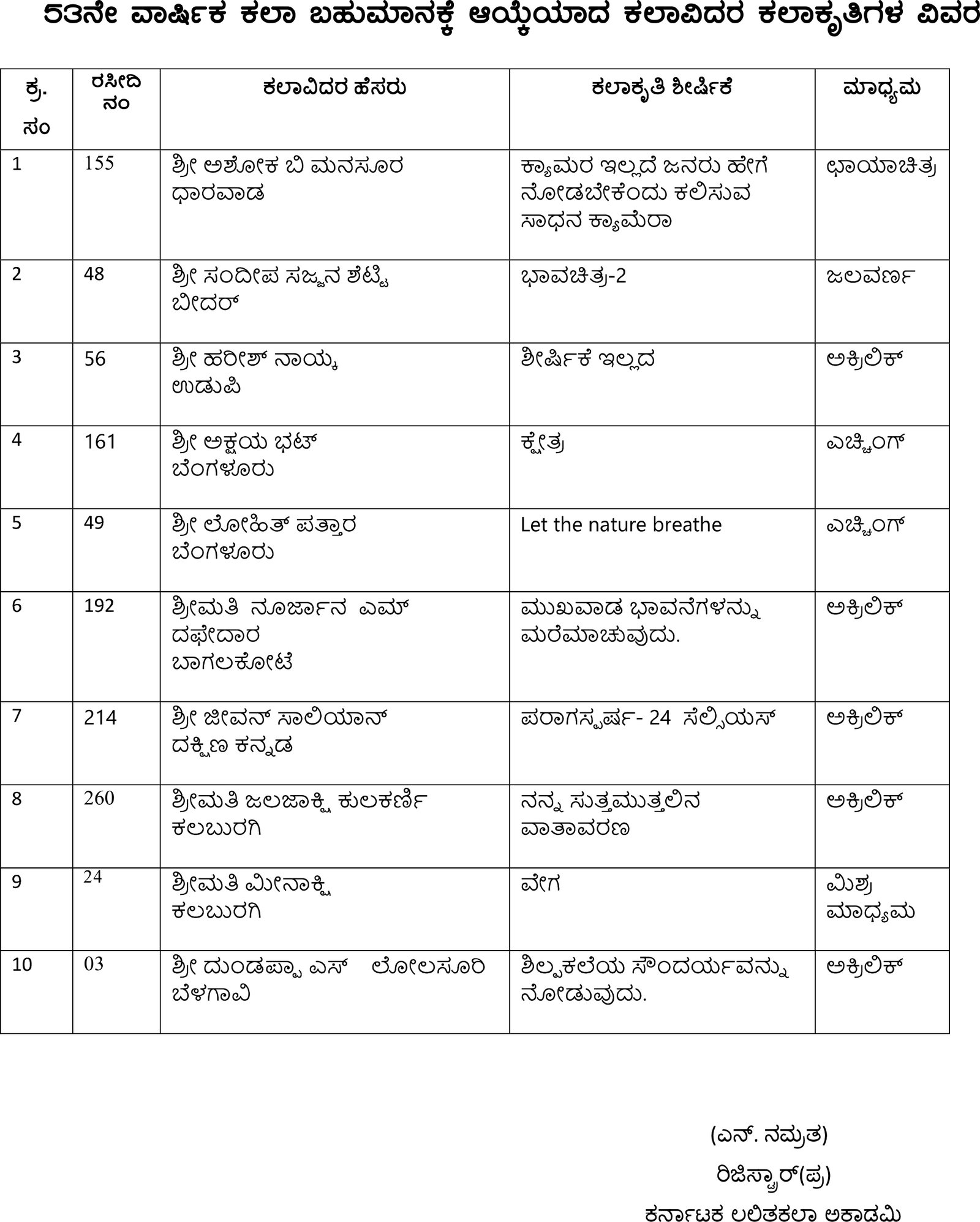 ಗೌರವ ಪ್ರಶಸ್ತಿಗೆ ಆಯ್ಕೆ ಮಾಡಲಾದ ಹಿರಿಯ ಕಲಾವಿದರಿಗೆ ತಲಾ 50,000/- ನಗದು ಮತ್ತು ಪ್ರಶಸ್ತಿ ಫಲಕ ನೀಡಿ ಗೌರವಿಸಲಾಗುತ್ತದೆ. ವರ್ಣಶ್ರೀ ಪುರಸ್ಕಾರಕ್ಕೆ ಆಯ್ಕೆಯಾದ ಕಲಾವಿದರಿಗೆ ಹಾಗೂ 53ನೇ ವಾರ್ಷಿಕ ಕಲಾ ಪ್ರದರ್ಶನ ಪ್ರಶಸ್ತಿ ಲಭಿಸಿದವರಿಗೆ 25,000/- ನಗದು, ಪ್ರಶಸ್ತಿ ಫಲಕ ನೀಡಿ ಗೌರವಿಸಲಾಗುತ್ತಿದೆ ಎಂದು ಕರ್ನಾಟಕ ಲಲಿತಕಲಾ ಅಕಾಡೆಮಿ ಪತ್ರಿಕಾ ಪ್ರಕಟಣೆಯಲ್ಲಿ ತಿಳಿಸಿದೆ.