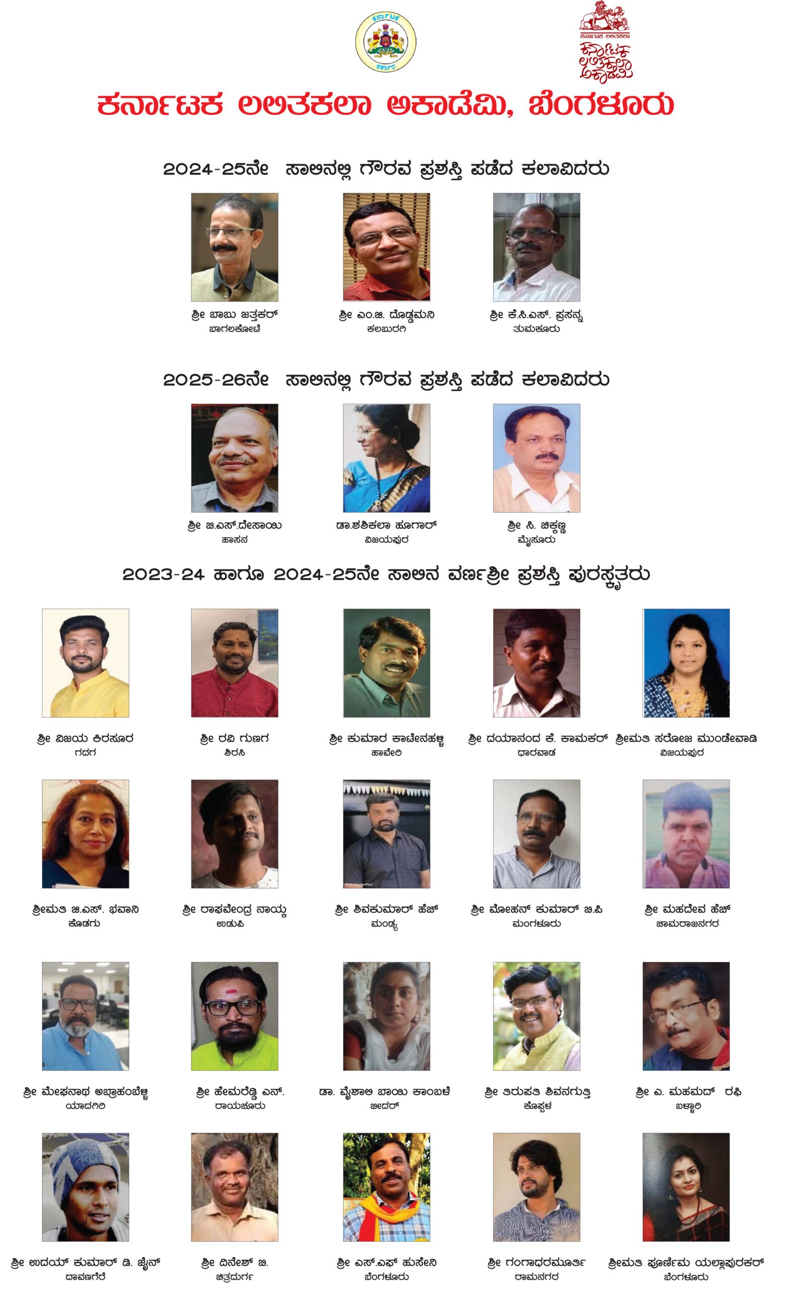 ರಾಜ್ಯದ ಆರುಮಂದಿ ಹಿರಿಯ ಕಲಾವಿದರಿಗೆ 2024-25ನೇ ಸಾಲಿನ ಮತ್ತು 2025-26ನೇ ಸಾಲಿನ ಗೌರವ ಪ್ರಶಸ್ತಿ ಪ್ರಕಟಿಸಲಾಗಿದೆ. ಬಾಗಲಕೋಟೆಯ ಬಾಬು ಜತ್ತಕರ್, ಕಲಬುರಗಿಯ ಎಂ.ಜಿ.ದೊಡ್ಡಮನಿ, ತುಮಕೂರಿನ ಕೆ.ಸಿ.ಎಸ್. ಪ್ರಸನ್ನ, ಹಾಸನದ ಬಿ.ಎಸ್.ದೇಸಾಯಿ, ವಿಜಯಪುರದ ಡಾ.ಶಶಿಕಲಾ ಹೂಗಾರ್, ಮೈಸೂರಿನ ಸಿ.ಚಿಕ್ಕಣ್ಣ ಗೌರವ ಪ್ರಶಸ್ತಿಗೆ ಭಾಜನರಾಗಿದ್ದಾರೆ. ಇದೇ ವೇಳೆ, 20 ಮಂದಿ ಕಲಾವಿದರಿಗೆ 2023-24ನೇ ಮತ್ತು 2024-25ನೇ ಸಾಲಿನ ವರ್ಣಶ್ರಿ ಪ್ರಶಸ್ತಿಯನ್ನು ಹಾಗೂ 53ನೇ ವಾರ್ಷಿಕ ಕಲಾ ಬಹುಮಾನಕ್ಕೆ ಆಯ್ಕೆಯಾದ 10 ಮಂದಿ ಕಲಾವಿದರ ಪಟ್ಟಿಯನ್ನೂ ಪ್ರಕಟಿಸಲಾಗಿದೆ.