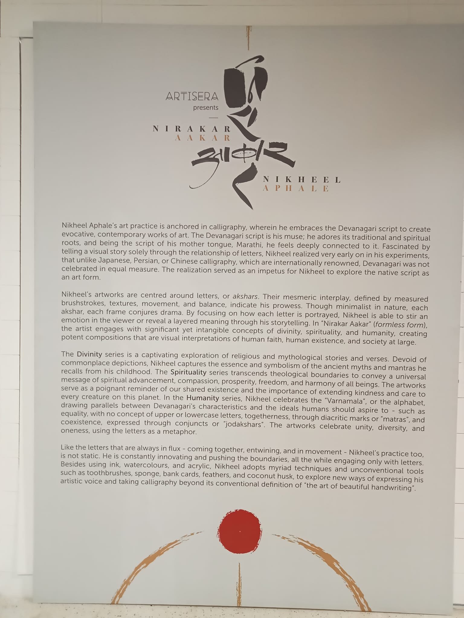 ಬೆಂಗಳೂರು ಅಂತಾರಾಷ್ಟ್ರೀಯ ಕೇಂದ್ರ (Bengaluru International Center)ದ ಕಲಾಗ್ಯಾಲರಿಯಲ್ಲಿ ಆರ್ಟಿಸೆರಾ ( ARTISERA ) ಆಯೋಜಿಸಿದ ನಿಖಿಲ್ ಅಪಾಲೆ ( Nikheel Aphale ) ಅವರ ” ನಿರಾಕಾರ ಆಕಾರ ” ಸಮಕಾಲೀನ ಕ್ಯಾಲಿಗ್ರಫಿ ಪ್ರದರ್ಶನ ಅನನ್ಯ. ಪ್ರಯೋಗಶೀಲ, ಕ್ರಿಯಾಶೀಲ ಪ್ರತಿಬಿಂಬ!