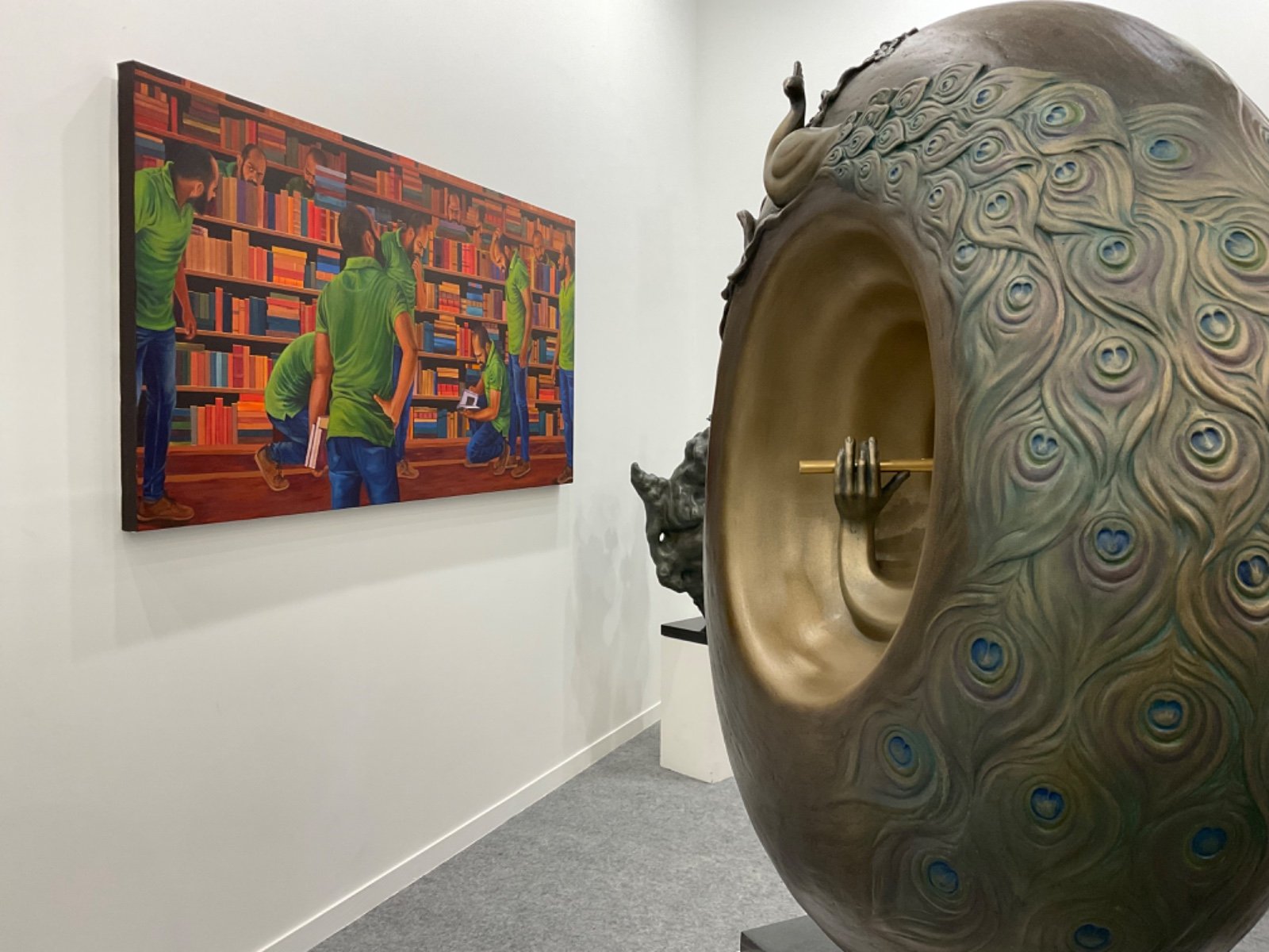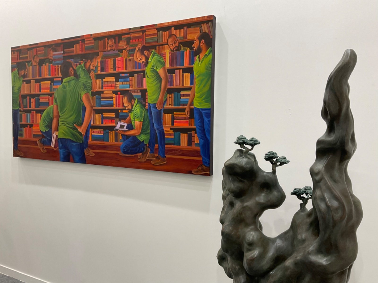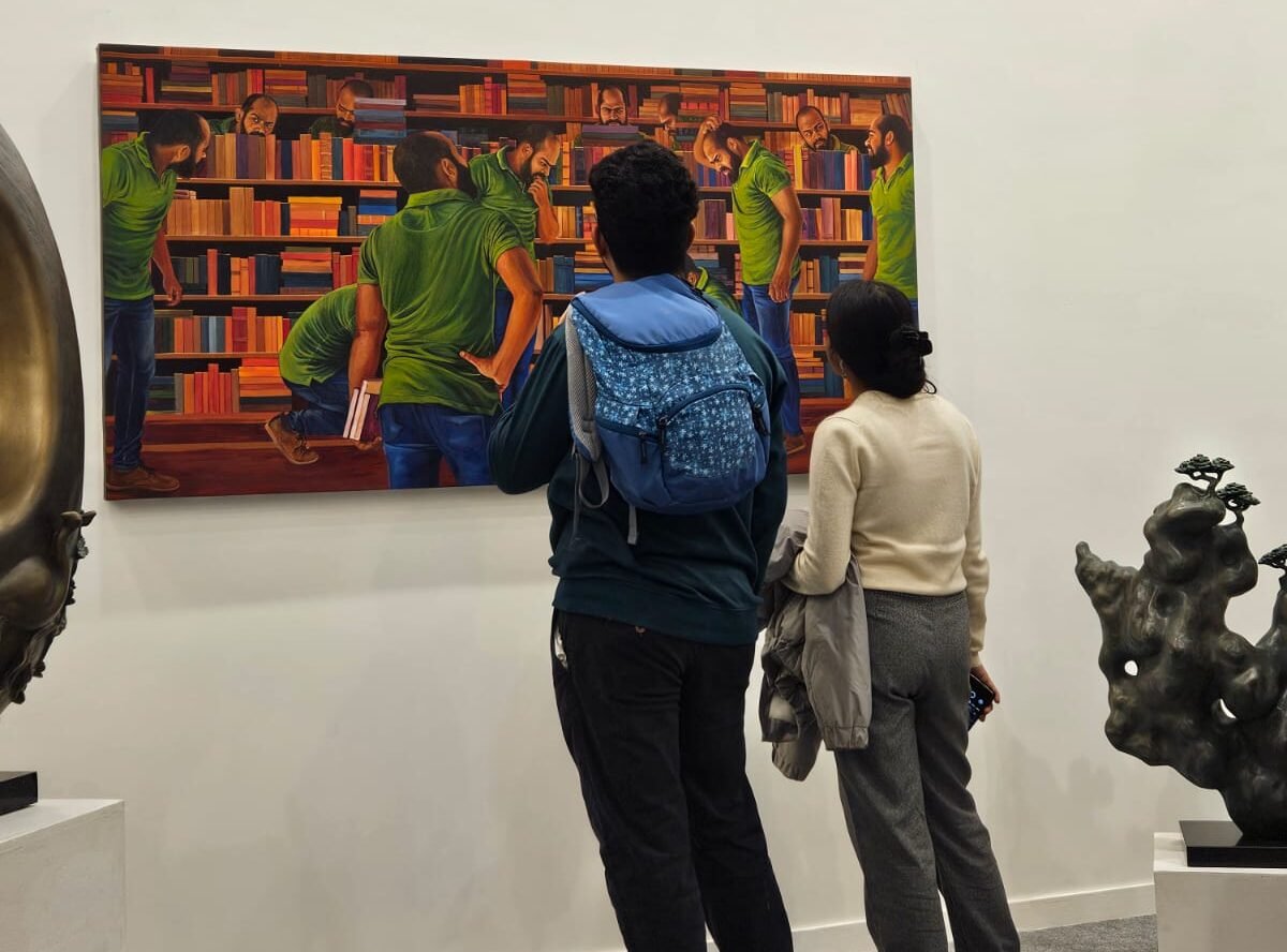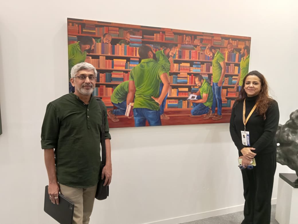 ಗ್ಯಾಲರಿಯ ಒಳ ಪ್ರವೇಶಿಸುತ್ತಿದ್ದಂತೆ ಶಿವಾನಂದ ಶಾಗೋಟಿ ಅವರ ಕಲಾಕೃತಿ ಗಮನ ಸೆಳೆಯಿತು. ಲೈಬ್ರರಿಯ ಸನ್ನಿವೇಶ, ಎಲ್ಲಾ ಭಂಗಿಯಲ್ಲೂ ಸ್ವತಃ ಕಲಾವಿದರೇ ಇದ್ದಾರೆ. ಯಾಕಿರಬಹುದು…? ಪ್ರಶ್ನೆ ಎದುರಾಗುತ್ತದೆ. ಮನಸ್ಸಲ್ಲೇ ಒಂದು ನಗು ಹುಟ್ಟಿಕೊಳ್ಳುತ್ತೆ. ಒಳಕ್ಕೆ ಕರೆದೊಯ್ಯುವ ದೃಶ್ಯ ಗಾಂಭೀರ್ಯ ಭಾವ ಮೂಡಿಸುತ್ತದೆ.