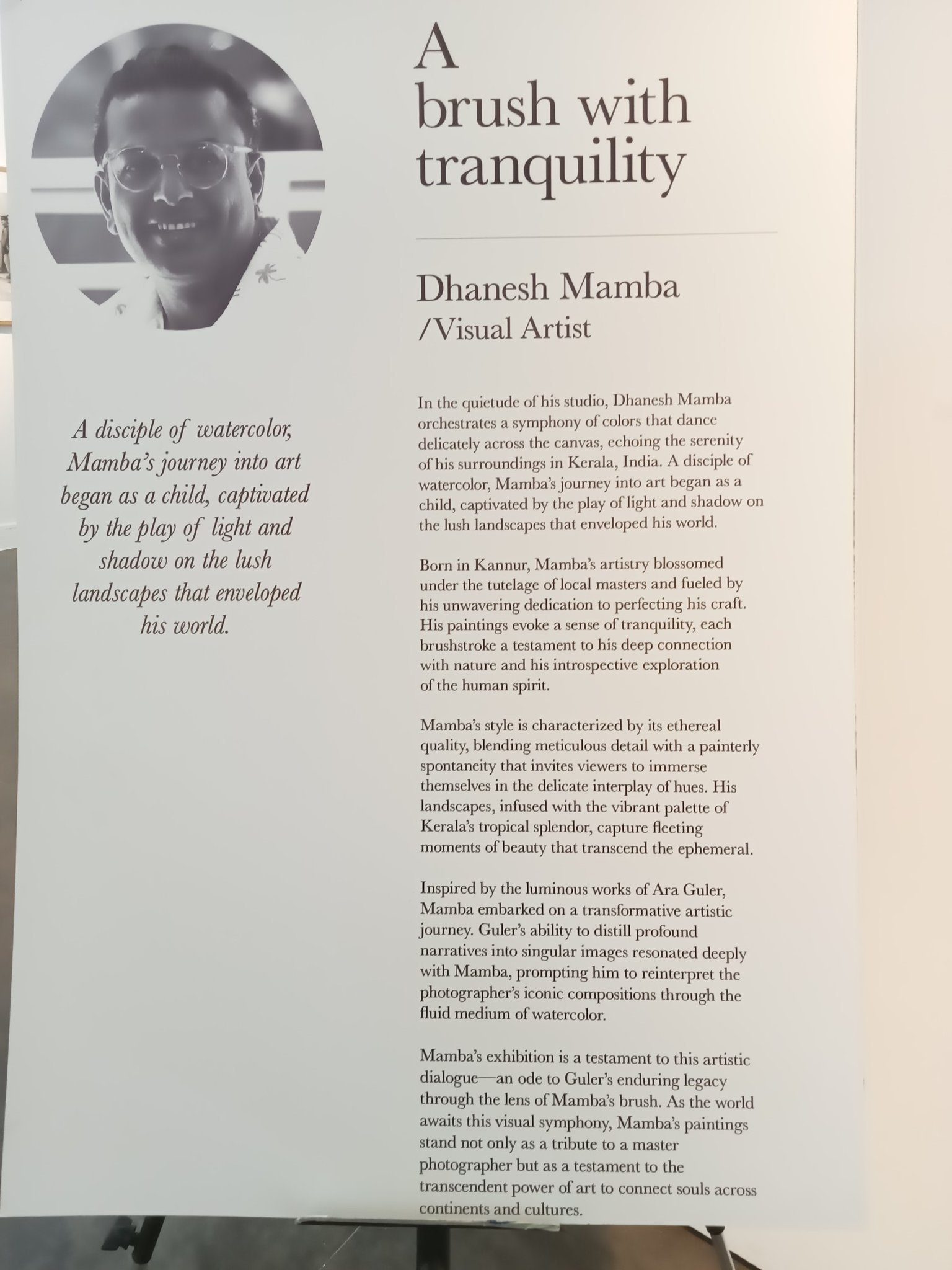 ಕೇರಳದ ದೃಶ್ಯ ಕಲಾವಿದ ಧನೇಶ್ ಮಾಂಬಾ (Dhanesh Mamba) ಅವರು ಟರ್ಕಿಯ ಖ್ಯಾತ ಫೋಟೋ ಜರ್ನಲಿಸ್ಟ್, ಛಾಯಾಗ್ರಾಹಕ ಅರಾ ಗುಲರ್ (Ara Guler) ಅವರ ಕ್ಯಾಮರಾ ಕಣ್ಣಲ್ಲಿ ಸೆರೆಸಿಕ್ಕ ದೃಶ್ಯಗಳನ್ನು ಬಹಳ ಸೊಗಸಾಗಿ ಚಿತ್ರಿಸಿದ್ದಾರೆ. ಗುಲರ್ ಅವರ ಛಾಯಾಚಿತ್ರದ ದೃಶ್ಯಗಳನ್ನು ಯತಾವತ್ ಬಳಸಿಕೊಂಡಿದ್ದಾರೆ. ಜಲವರ್ಣದಲ್ಲಿ ಮೂಡಿಬಂದಿರುವ ಕಲಾಕೃತಿಗಳಲ್ಲಿ ಮಾಂಬಾ ಎಲ್ಲಿಯೂ ಅಕಾಡೆಮಿಕ್ ಅಧ್ಯಯನದ ಅಲಿಖಿತ ನಿಯಮಗಳನ್ನು ಮೀರದಿರುವುದು ಗಮನ ಸೆಳೆಯಿತು. ಛಾಯಾಚಿತ್ರಗಳಲ್ಲಿನ ನೆರಳು-ಬೆಳಕನ್ನು ಉಳಿಸಿಕೊಂಡು, ಜಲವರ್ಣದ ಲಕ್ಷಣಗಳಿಗೂ ಧಕ್ಕೆಯಾಗದಂತೆ ಚಿತ್ರಿಸಿರುವುದು ವಿಶೇಷವೆನಿಸಿತು.